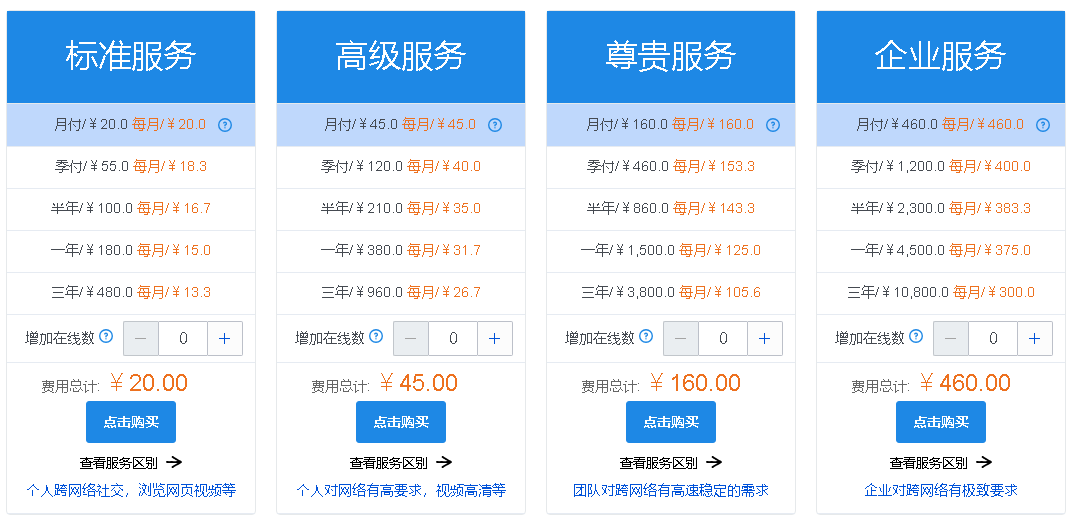 第2步:然後選擇自己需求的服務,點擊-購買,付款後按教程設置就可以使用了!