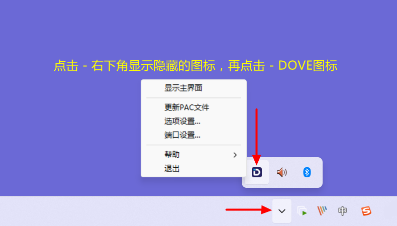 | 如要退出客户端:在电脑右下角,右键点击图标可以退出DOVE客户端 |