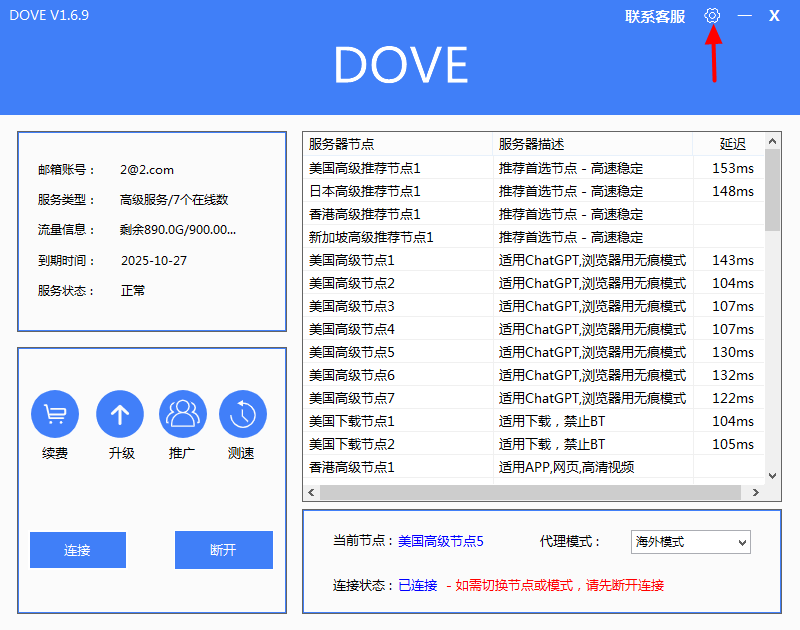第1步:首先确定DOVE加速器连接成功,点击右上角的设置按钮